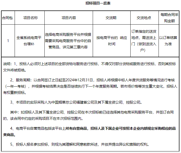 本公司受中国烟草总公司福建省公司的委托,对全省系统电商平台增补项目的下述货物、服务进行国内公开招标,现欢迎国内合格的投标供应商前来提交密封的投标文件。