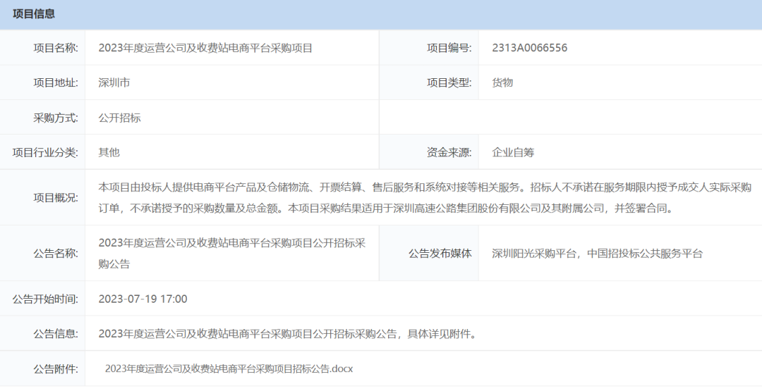 深圳高速公路集团股份有限公司2023年度运营公司及收费站电商平台采购项目公开招标采购公告