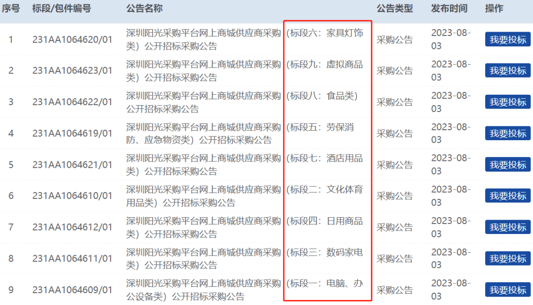 深圳阳光采购平台网上商城供应商采购(标段1-9)公开招标采购公告