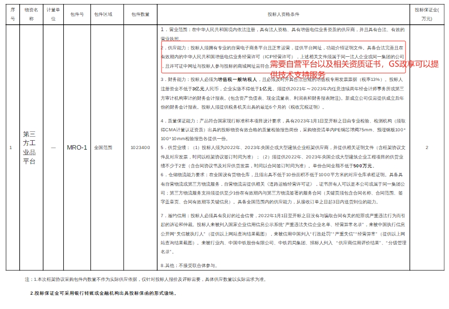 2.2.1为提高我局在建和新开工项目采购效率,降低采购成本,更好的和供应商建立长期稳定、互惠共赢的合作,现决定对四局商城供应商进行框架协议入库招标,2024年度需招标的第三方工业品平台实行框架协议招标采购,选择一定数量供应商作为入围供应商,签订年度采购框架协议,确定上限价格,有效期一年。产品将在四局商城(https:/sisc.ctce4mal.cn)展示,协议有效期内,入围供应商自有商城与四局商城平台进行对接,每种规格型号的标的物价格、规格型号、质量标准、图样等)在四局商城进行网上展示销售。框架协议有效期内,中铁四局集团有限公司所属工程项目采购框架协议所涵盖的物资时,有权选择四局商城二次竞价的方式,向本次招标签署框架采购协议的入围供应商实施采购。2.2.2本次框架协议招标采购物资品种、包件划分详见附表1。2.2.3本次框架协议采购各包件内数量不作为实际供应依据,仅针对投标人报价及评标需要,具体供应数量以实际需求为准。2.3招标人发布入围结果公示前,有权组织相关人员对评标委员会推荐的框架协议入围候选人生产厂家进行实地考察,生产厂家需子以配合和协助,被推荐并通过考察的入围候选人,招标人确定其为入围供应商。本次招标投标人的资质审查采用资格后审方式,评标办法采用经评审的最低投标价法凡有意参加投标的潜在投标人请于公告之日起至2024年6月11日24时00分2024年6月18日上午日 9时30分(即为开标时间) 此文件未全部展示,如需要招标公告原文件,请联系GS政享