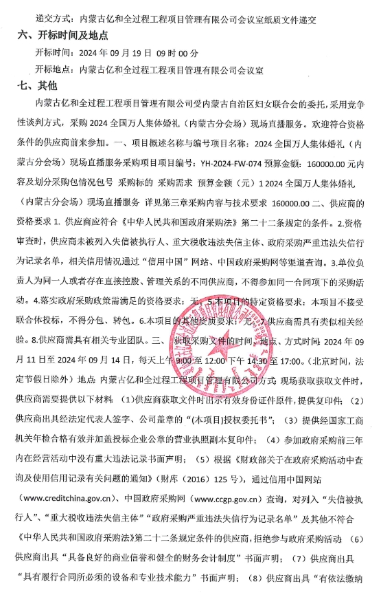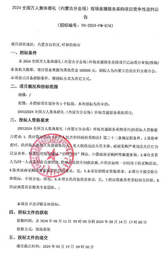 本 2024全国万人集体婚礼(内蒙古分会场)外场直播服务采购项目己由项目审批/核准备案机关批准,项目资金来源为其他资金160000元,招标人为内蒙古自治区妇女联合会。本项目已具备招标条件,现招标方式为其它方式。