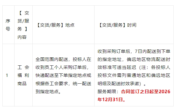 本次采购是通过公开招标的方式确定6家中标人(如果通过符合性评审的有效标只有5家,则确定5家中标人;以此类推,不足6家中标人时,按最终通过符合性的家数,确定中标人),负责2025-2026年度内对“员工福利商城”工会福利商品,按照协议价格进行定点采购和供货,并提供物流配送及售后服务等。