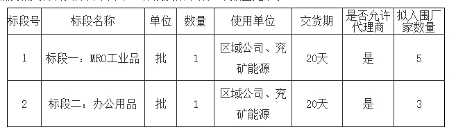 标段一:MRO工业品,采购范围为集团公司用于维护、维修、运行设备的非生产原料性质的工业用品,品类包括不限于化工产品、橡胶塑料、电线电缆、电工产品、仪器仪表、工具器具、密封紧固、建筑五金、防护用品、土产材料、消防器材、管件泵阀、日用电器等。