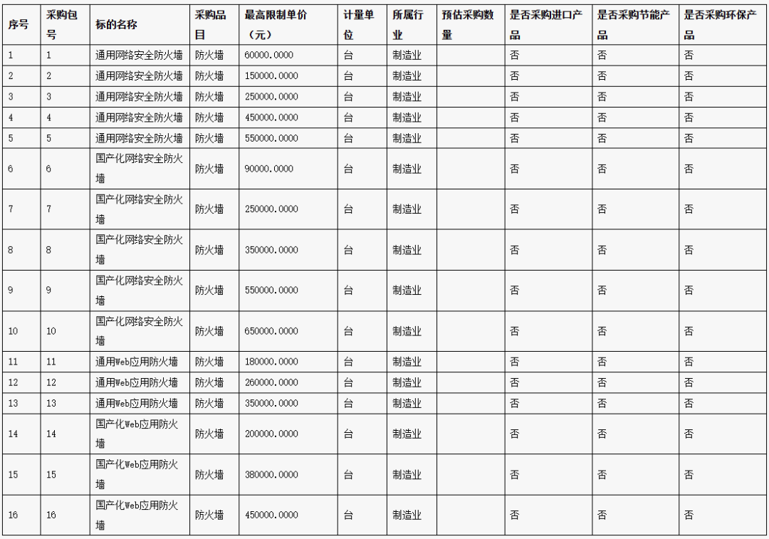 3、征集项目简介:本项目所属分类为“货物类”,共分16个包,其中1-10包为网络安全防火墙,11-16包为Web应用防火墙(详见附件)。